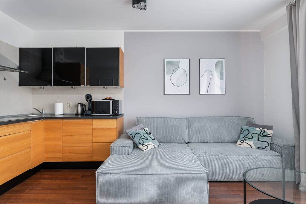 Wyposażenie i udogodnienia: Nasz dwupokojowy apartament o powierzchni 53m^2 został zaprojektowany z myślą o Państwa komforcie. Sypialnia wyposażona jest w duże, podwójne łóżko, płaski telewizor oraz przestronną szafę z wieszakami. W części dziennej znajduje się wygodna, rozkładana sofa oraz stół, który doskonale sprawdzi się zarówno podczas posiłków, jak i jako miejsce do pracy.